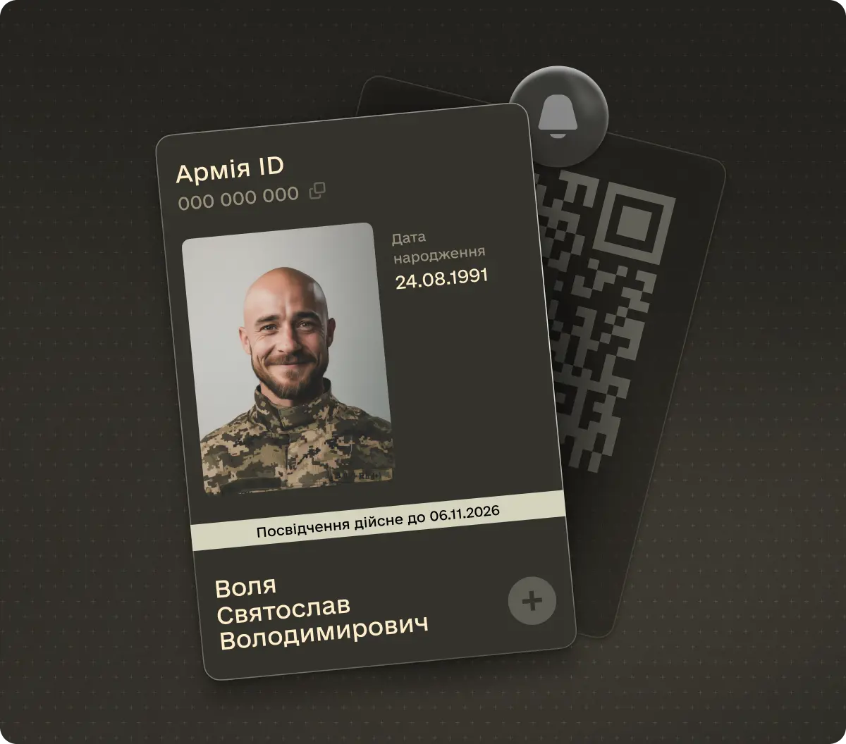 Армія ID — це посвідчення захисника(-ці) для підтвердження статусу військовослужбовця(-иці) у повсякденних ситуаціях. У ньому є фото та базова інформація, доступна за QR-кодом, а також унікальний ID-номер, потрібний для подання рапортів.